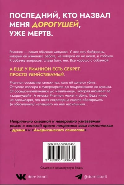 Rhiannon makes lists of people she wants to kill. From the stupid cashier at the supermarket to the guy who cut her off. From the kleptomaniac neighbor to the boss who calls her "darling". And sometimes Rhiannon can kill. After all, no one will suspect that a quiet secretary was able to neutralize and (dismember) the rapist who attacked her...