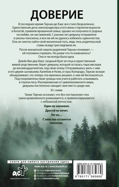 Lately, Tiernan de Haas hasn't cared about anything. The only daughter of a movie producer and his wife starlet grew up in a rich, privileged family, but did not receive from her relatives neither love nor guidance. From an early age, the girl was sent to boarding schools, and yet she could not escape loneliness. She could not find her way in life, because the shadow of parental fame everywhere followed her. After the sudden death of her parents, Tiernan realizes that she is supposed to grieve. But has anything changed? She's always been alone. Jake Van der Berg, her father's half-brother and only living relative, takes the girl, who is a couple months away from her eighteenth birthday, into his care. Sent to live with him and his two sons, Caleb and Noah, in the mountains of Colorado, Tiernan soon discovers that these men now decide what she should worry about. Under their patronage, she learns to work, to survive in the backwoods, and gradually finds her place among them.