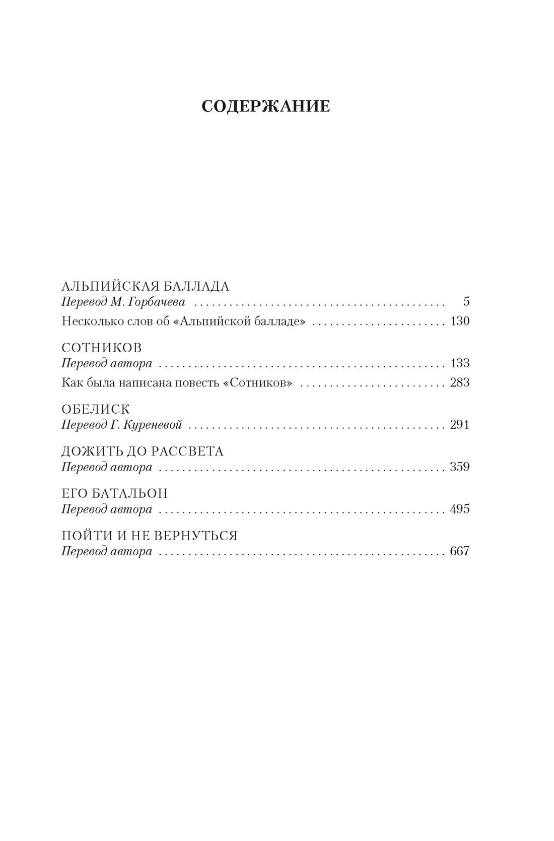 "The author of the most poignant books about the war", "the most read Belarusian author in the whole world", "the last realistic writer of Europe" - all this is said about Vasil Bykov. Three days before the beginning of the Great Patriotic War Vasil Bykov was 17 years old. In 1942, yesterday's student of the Vitebsk Art College and extern of the Vitebsk school of factory and factory training was drafted to the front, where he participated in the battles for Krivoy Rog, Alexandria, Znamenka, passed through the territory of Romania, Bulgaria, Yugoslavia, Austria, twice was wounded. In 1947, the first story of the young writer was published. Bykov's works marked in literature a new stage of comprehension of military events, combining the tragic concreteness of war, "trench truth", with the "eternal" problems of existence. How to preserve humanity in inhuman circumstances? What to save among the horrors of war - the body or the soul? For what does a man suffer, does he live only for himself? On these and other questions are looking for answers to the heroes of Vasil Bykov, an outstanding master of military prose of the twentieth century. The collection includes the famous stories "Alpine Ballad", "Sotnikov", "Obelisk", "To Live to Dawn", "His Battalion", "To Go and Not Return".