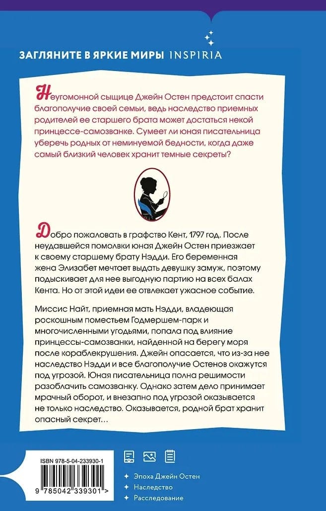 The indefatigable detective Jane Austen must save her family's fortune when her older brother's inheritance threatens to go to a pretender princess. Can the young writer save her family from impending poverty when even her closest friends harbor dark secrets?