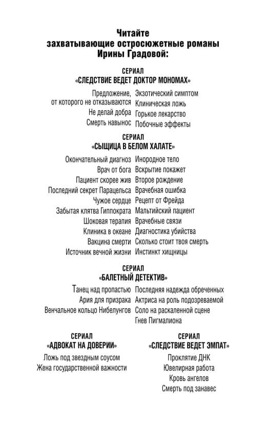 Dr. Knyazev, better known by his nickname Monomakh, is in emergency mode. A patient dies of an unknown illness, and a few days later, her mother is admitted to the clinic with similar symptoms. None of the infectious disease specialists can diagnose the illness, and the tests are contradictory, but the young beauty has died, with traces of the disease leading to the plastic surgery department, where she recently underwent breast augmentation. Although these patients are not part of his department, Monomakh conducts his own investigation and discovers that a third person connected to the clinic has fallen ill...