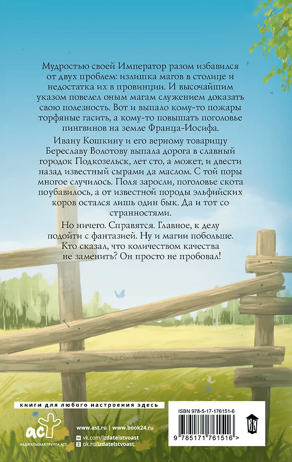 Ivan Koshkin and his faithful companion, Bereslav Volotov, were destined for the glorious town of Podkozelsk, once famous for its cheeses and butter. True, that was a long time ago, a hundred, maybe two hundred years. Much has happened since then. The fields have become overgrown, the livestock has dwindled, and of the famous breed of elven cows, only one bull remains. And even that one is a bit odd. But no matter. They'll manage. The main thing is to approach the matter with imagination. And lots of magic. Who said quantity can't replace quality? They just haven't tried!
