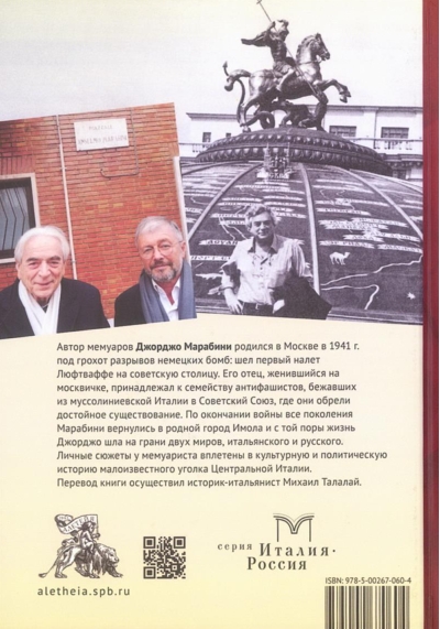 Giorgio Marabini, the author of this memoir, was born in Moscow in 1941, amid the German bombings of the Luftwaffe's first raid on the Soviet capital. His father, who married a Muscovite, belonged to a family of anti-fascists who fled Mussolini's Italy for the Soviet Union, where they found a dignified existence. After the war, all four generations of Marabini returned to their hometown of Imola, and from then on, Giorgio's life straddled two worlds, Italian and Russian. The memoirist weaves personal stories into the cultural and political history of this little-known corner of Central Italy.