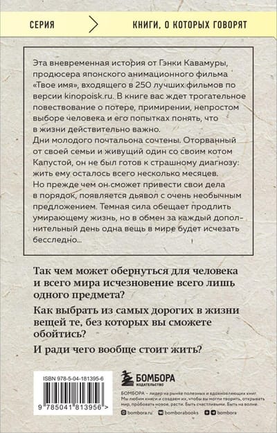 The days of a young postman are numbered. Torn away from his family and living alone with his cat Kapusta, he was not prepared for the terrible diagnosis: he has only a few months to live. But before he can put his affairs in order, the devil appears with a very unusual offer. The dark force promises to prolong the dying man's life, but in exchange for each additional day, one thing in the world will disappear without a trace... And so begins a very strange week that puts the young postman and his beloved cat on the brink of existence. With each disappearing object, the postman reflects on the life he lived, his joys and regrets, as well as the people he loved and lost.