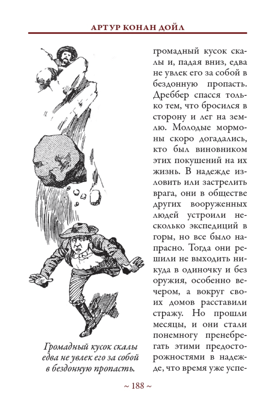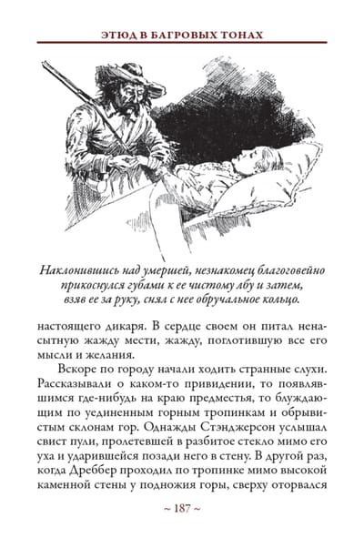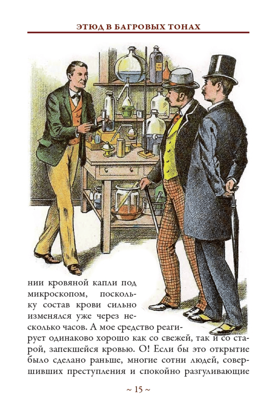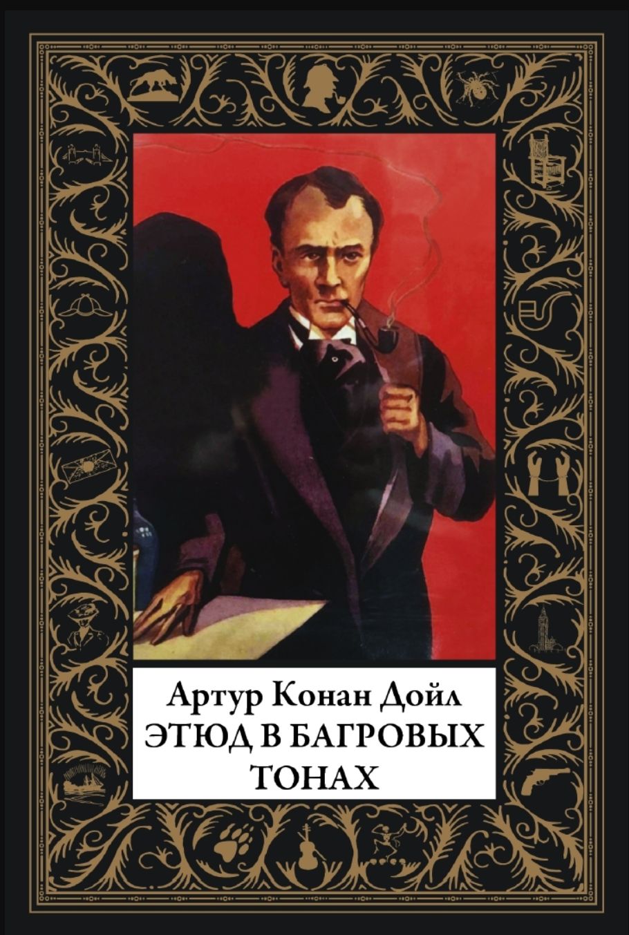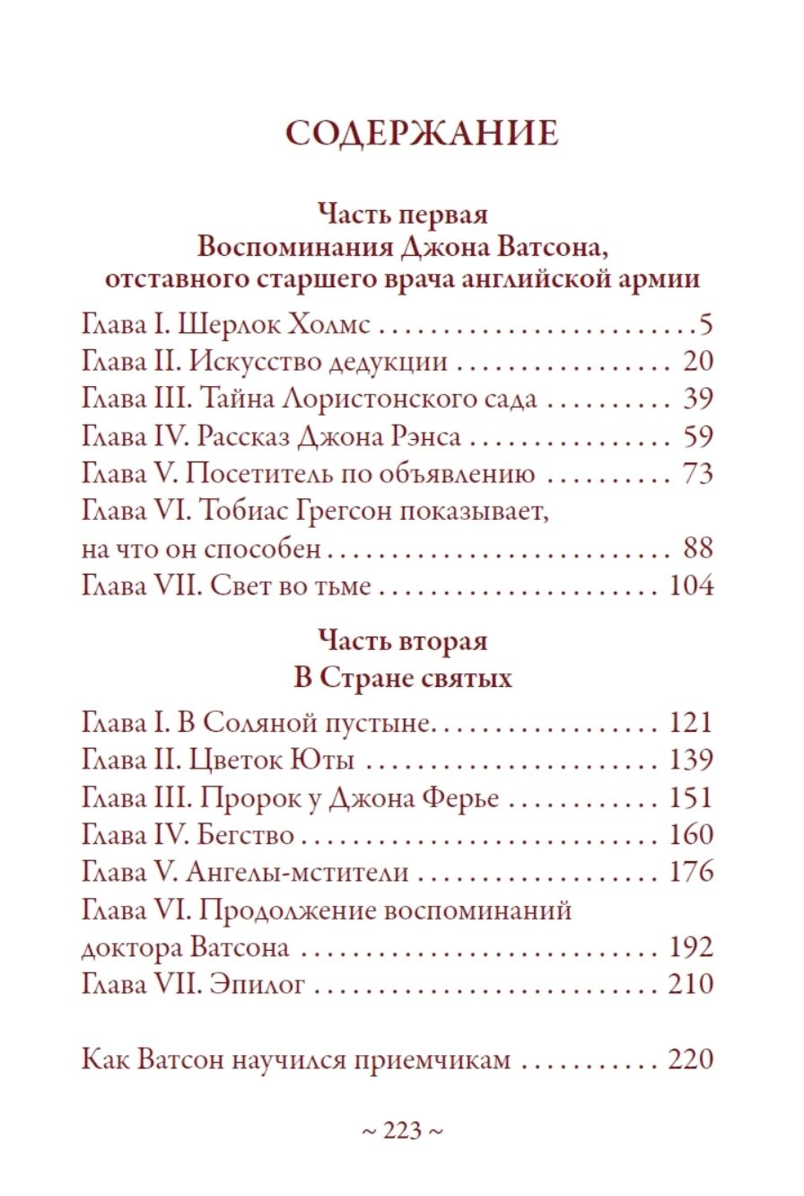The collection includes the story "A Study in Scarlet," which is Arthur Conan Doyle's first work about the famous detective Sherlock Holmes and his friend Dr. Watson, and a parody story "How Watson Learned His Tricks," which is not included in the canonical collection of stories about the famous detective and was written by Conan Doyle especially for the library of Queen Mary's Doll's House.