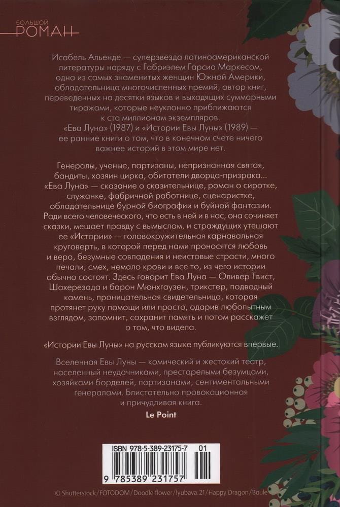 Isabel Allende is a superstar of Latin American literature along with Gabriel Garcia Marquez, one of the most famous women in South America, winner of numerous awards, author of books translated into dozens of languages and with print runs that are steadily approaching one hundred million copies. "Eva Luna" (1987) and "The Stories of Eva Luna" (1989) are her earliest books about how ultimately nothing is more important than stories in this world. Generals, scientists, partisans, an unrecognized saint, bandits, a circus owner, the inhabitants of a ghost palace... "Eva Luna" is a tale of a storyteller, a novel about an orphan, a maid, a factory worker, a screenwriter, the owner of a turbulent biography and an exuberant imagination. For the sake of all that is human in her and in us, she composes fairy tales, mixes truth with fiction, and those who suffer are comforted by her "Stories" - a dizzying carnival whirlwind, in which love and faith, crazy coincidences and violent passions, a lot of sadness, laughter, a lot of blood and everything that stories usually consist of. Here speaks Eva Luna - Oliver Twist, Scheherazade and Baron Munchausen, a trickster, a pitfall, a perceptive witness, who will lend a helping hand or simply, giving a curious look, remember, keep the memory and then tell about what she saw.