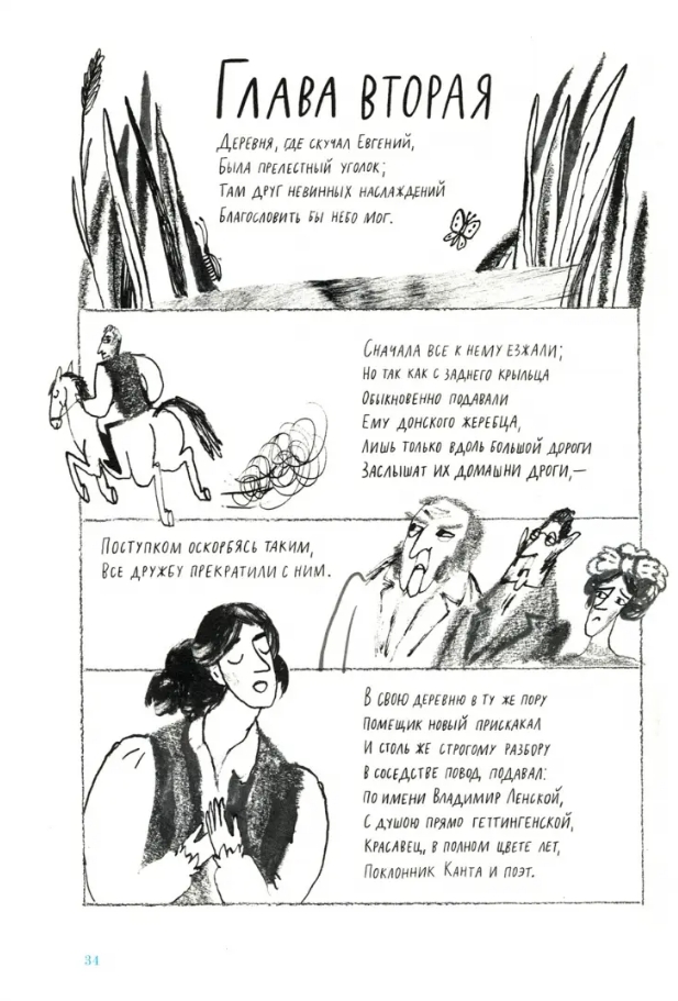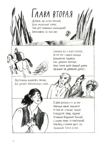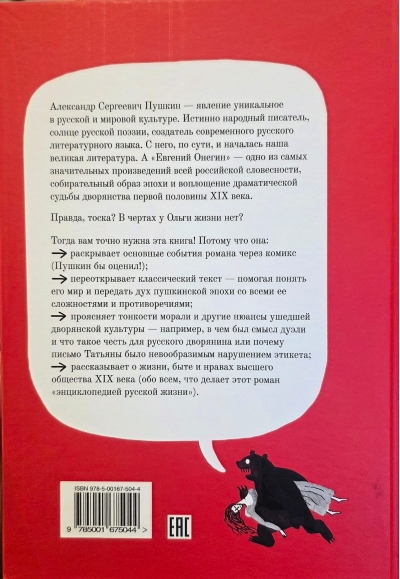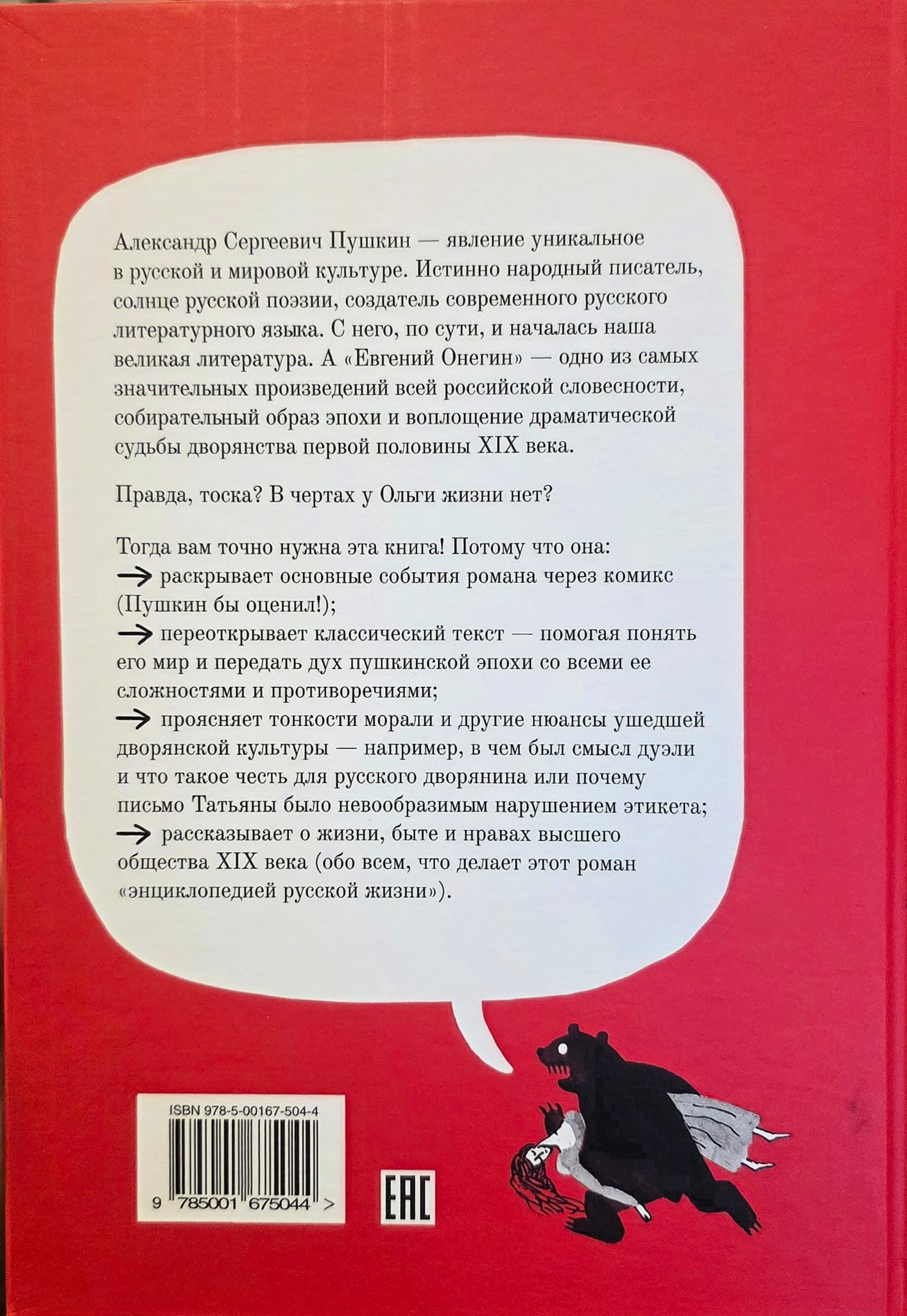 This is a graphic guide to Alexander Pushkin's novel "Eugene Onegin." Written by Alexei Oleinikov and illustrated by Natasha Yaskina, it's a graphic novel.