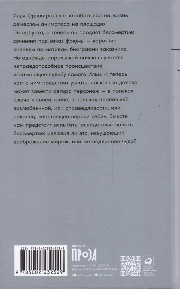 Ilya Orlov used to make a living as an animator on the squares of St. Petersburg, but now he sells immortality: he composes custom-made fayums - short novellas based on the biography of a customer. But one April night there is an unlikely accident that distorts the fate of Ilya himself. And now he and I will have to find out how far the author can take the character - in search of the key to his mystery, in search of a missing lover, or justice, or, finally, "the real version of himself". Together we will have to experience, to witness immortality: is it an illusion, a mirage tempting the imagination, or a true miracle?