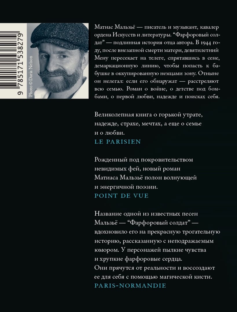 "The Porcelain Soldier" is the true story of the author's father. The action takes place during World War II. In 1944, after the sudden death of his mother, nine-year-old Menou secretly crosses the demarcation line between the free and occupied zones in a cart, hidden in hay, to reach his grandmother. His grandmother's farm is located in German-occupied Lorraine, declared part of the Third Reich, where even the French language is banned. Menou's new illegal life on a small farm is fraught with danger: if the occupiers discover him, they will shoot the entire family. Furthermore, his relatives are hiding not only him but also a Jewish girl, a friend of his mother's. And yet, despite the constant risk, the agonizing underground existence presents the boy with astonishing discoveries. A novel about war, about childhood under bombs, about first love, hope, and self-discovery.