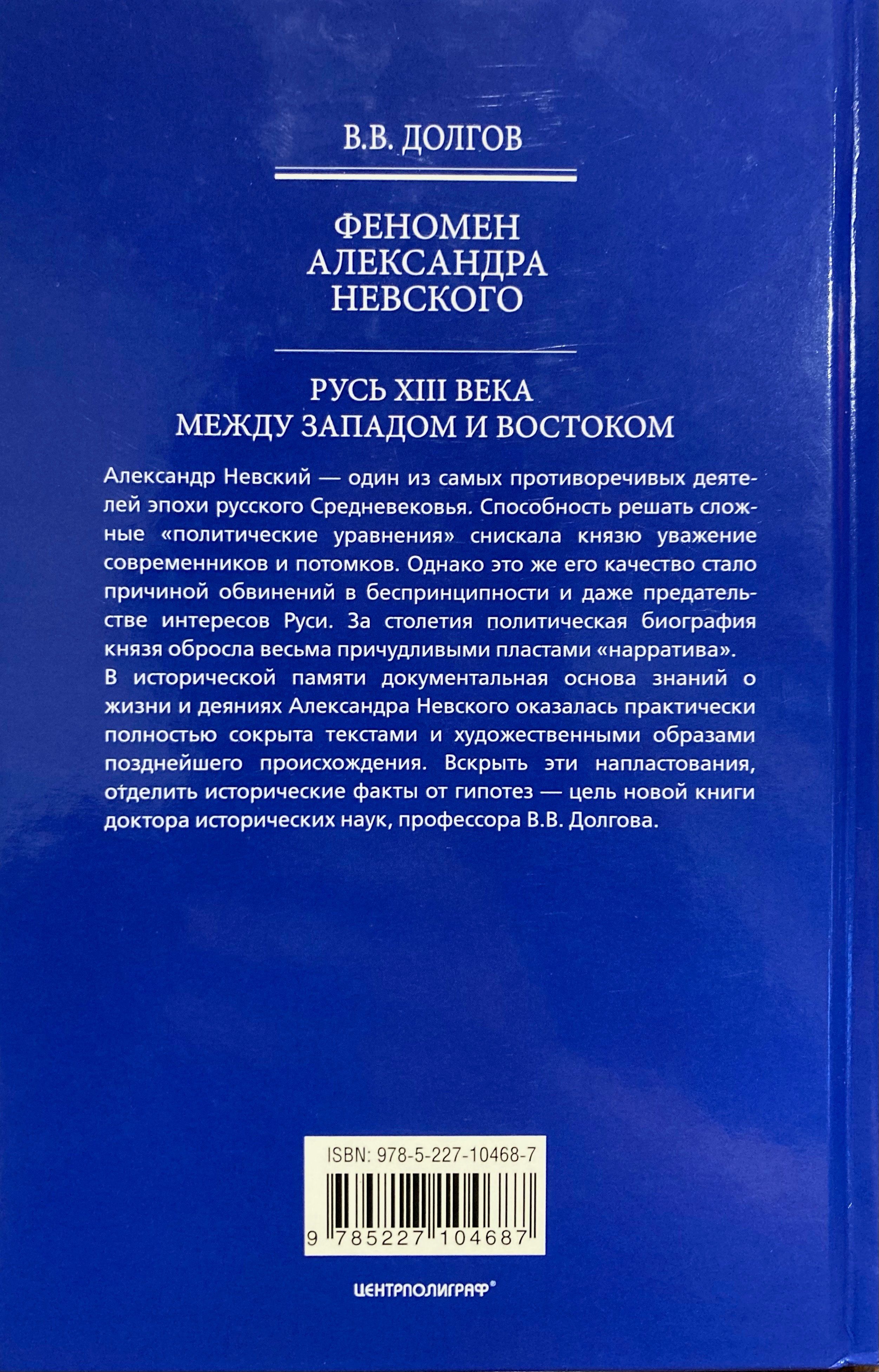 Alexander Nevsky is one of the most controversial figures of the Russian Middle Ages. His ability to solve complex "political equations" earned the prince the respect of his contemporaries and descendants. However, this same quality of his became the reason for accusations of unscrupulousness and even betrayal of the interests of Rus'. Over the centuries, the prince's political biography has acquired very bizarre layers of "narrative". In historical memory, the documentary basis of knowledge about the life and deeds of Alexander Nevsky turned out to be almost completely hidden by texts and artistic images of later origin. To reveal these layers, to separate historical facts from hypotheses is the goal of the new book by Doctor of Historical Sciences, Professor V.V. Dolgov.