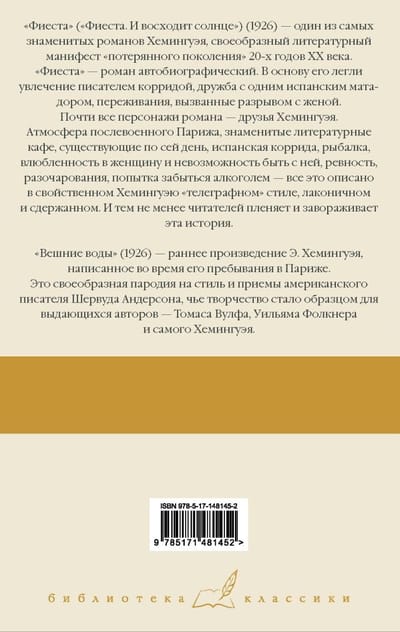Fiesta ("Fiesta. And the sun rises") (1926) - one of Hemingway's most famous novels, a kind of literary manifesto of the "lost generation" 20-ies XX century. "Fiesta" - an autobiographical novel. It is based on the writer's fascination with bullfighting, friendship with a Spanish matador, experiences caused by the breakup with his wife. Almost all the characters in the novel are friends of Hemingway. The atmosphere of postwar Paris, the famous literary cafes that exist to this day, the Spanish bullfight, fishing, falling in love with a woman and the impossibility of being with her, jealousy, disappointment, an attempt to forget alcohol - all this is described in Hemingway's peculiar "telegraphic" style, laconic and restrained. And yet readers are captivated and mesmerized by this story. "Spring Waters" (1926) - an early work by E. Hemingway, written during his stay in Paris. It is a kind of parody of the style and techniques of the American writer Sherwood Anderson, whose work became a model for outstanding authors - Thomas Wolfe, William Faulkner and Hemingway himself.
