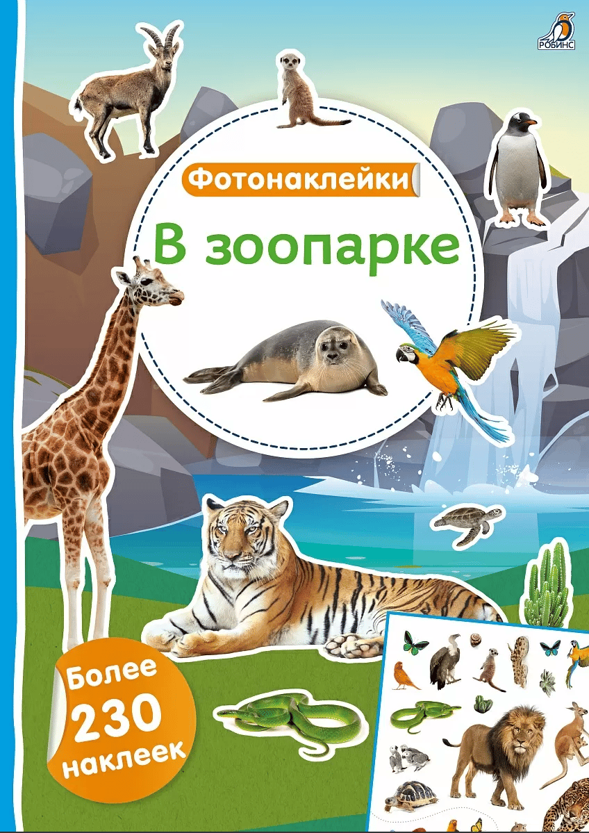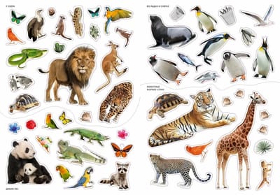 It contains over 230 photo stickers with realistic images of animals that live in the zoo: monkeys, tigers, giraffes, seals, penguins, parrots, fish, etc.