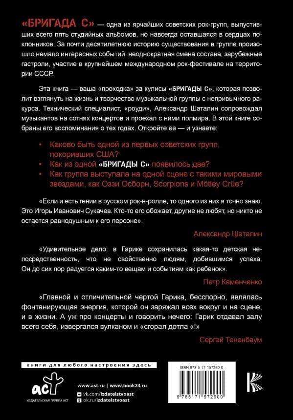 "Brigada S" - one of the brightest Soviet rock bands, which released only five studio albums, but forever remained in the hearts of fans. For almost ten years of their existence, the band had many interesting events: repeated changes of the line-up, foreign tours, participation in the largest international rock festival in the USSR. This book is your "walkthrough" behind the scenes of "Brigade C", which will allow you to look at the life and work of the musical group from an unusual angle. Alexander Shatalin, a technical specialist, "roadie", accompanied the musicians at hundreds of concerts and traveled with them halfway around the world. This book contains his memories of those years. Open it - and you will find out: