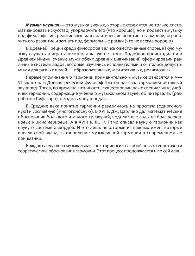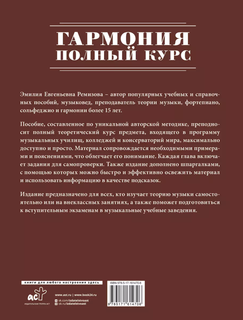 Harmony. The full course is a unique edition compiled according to the author's method. It contains a complete theoretical course of the subject, which is included in the program of music schools, colleges and conservatories around the world. Complex theoretical material is presented in the manual as clear and accessible as possible. Each chapter includes tasks for self-examination.