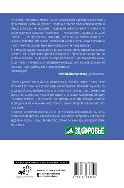 Before you is not a textbook for doctors and not an instruction manual for the treatment of all diseases. This book will help you to understand the principles of digestion and understand what went wrong in a simple and accessible way. The author draws attention to the most common mistakes and practical difficulties that arise on the way from the onset of illness to recovery. You will learn a great deal, if not everything, about digestion. And knowing how the stomach, liver and intestines work, it becomes easier to understand what exactly needs to be done to restore them. Sergey Vyalov is a doctor-gastroenterologist with international qualification and experience in Germany, hepatologist, candidate of medical sciences, medical consultant of TV programs. He has more than 160 scientific articles and more than 20 books for doctors.