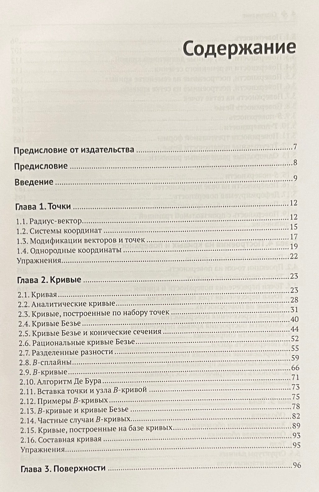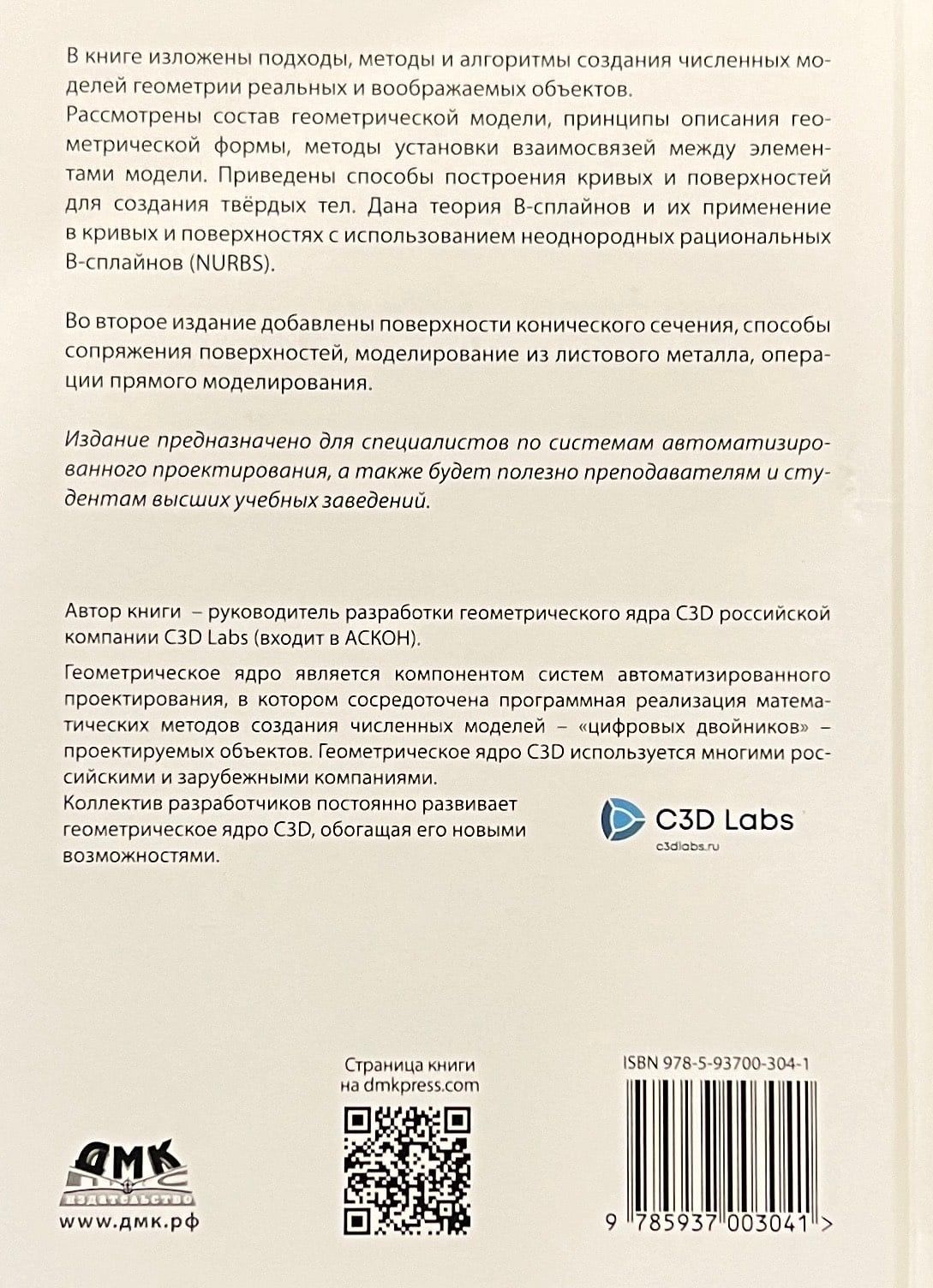 The book presents approaches, methods and algorithms for creating numerical models of geometry of real and imaginary objects. The composition of a geometric model, principles of geometric shape description, methods of establishing relationships between the elements of the model are considered. Methods of construction of curves and surfaces for creation of solids are given. The theory of B-splines and their application to curves and surfaces using nonuniform rational B-splines (NURBS) is given.