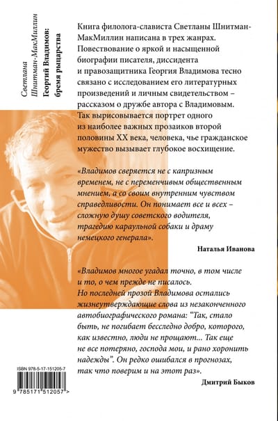 The book by philologist and Slavist Svetlana Shnitman-McMillin is written in three genres. The narrative of the bright and rich biography of the writer, dissident and human rights activist Georgi Vladimov is closely connected with the study of his literary works and personal testimony - the story of the author's friendship with Vladimov. In this way a portrait of one of the most important prose writers of the second half of the 20th century and a man whose civic courage is deeply admired emerges.