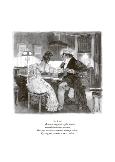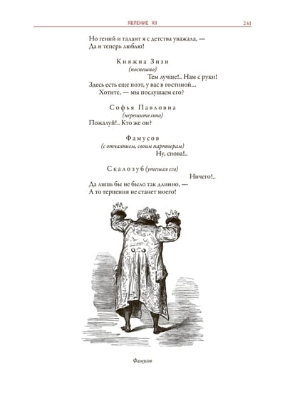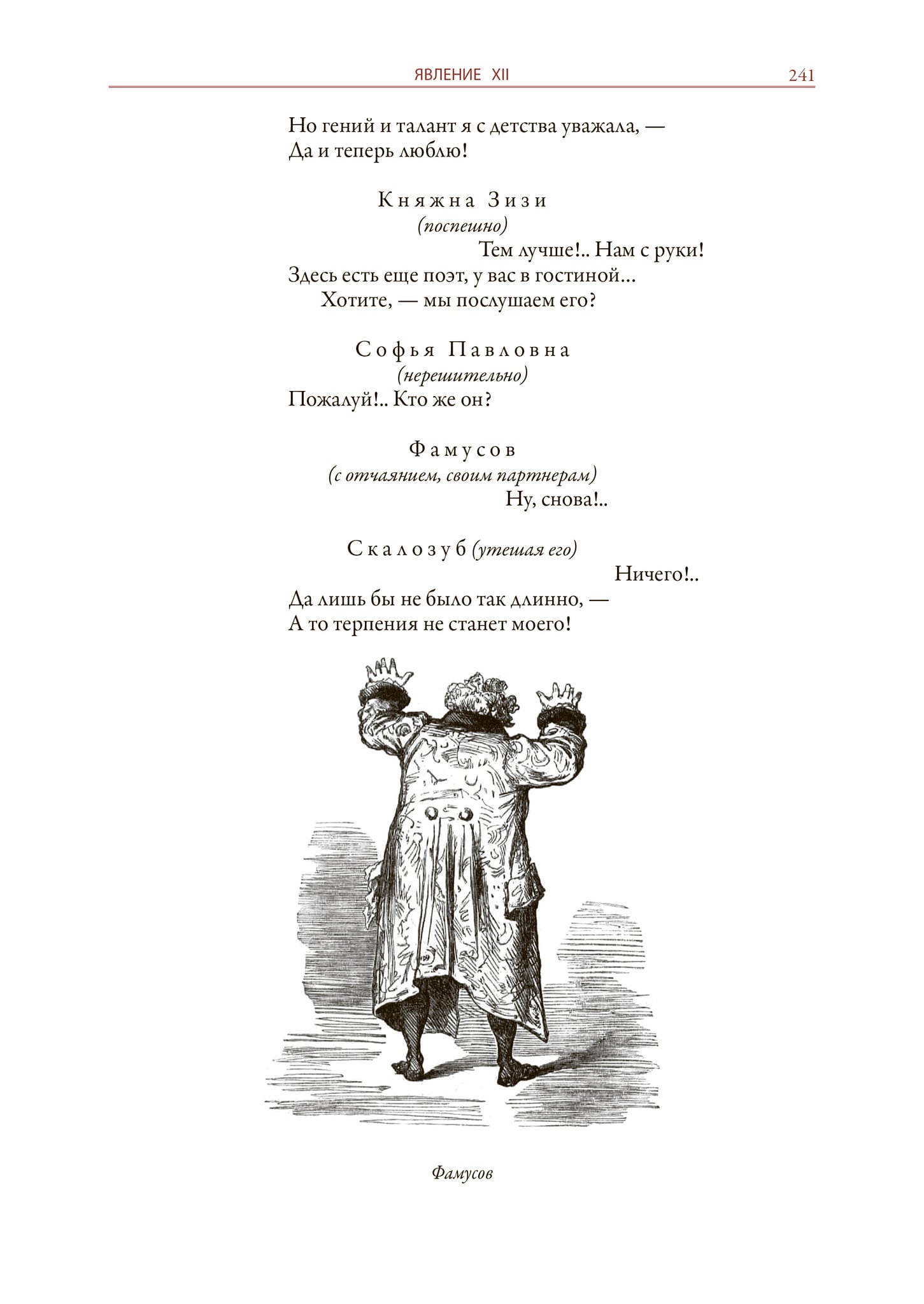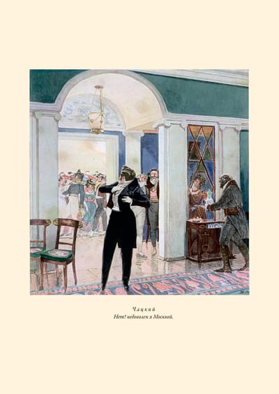 The collection includes Alexander Sergeevich Griboyedov's (1795-1829) comedy "Woe from Wit" - one of the pinnacles of Russian drama and poetry, a magnificent satire on Moscow society of the early 19th century, and, as an appendix, its most famous sequel - a conversation in verse by Evdokia Petrovna Rostopchina (1811-1858) "Chatsky's Return to Moscow, or Meeting of Familiar Faces after Twenty-Five Years of Separation". The book is decorated with illustrations by the talented Russian artists Dmitry Nikolaevich Kardovsky (1866-1943) and Mikhail Sergeyevich Bashilov (1821-1870).