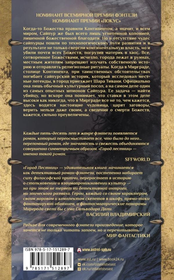 The Deities once ruled the Continent, and thus the world, while Saipur was merely an oppressed colony devoid of divine grace. But in the absence of miracles, the Saipurs took the technological path of development and as a result not only overthrew the Continent, but also killed almost all of the Deities, plunging the continent into chaos. Everything created by the Deities has disappeared, cities lie in ruins, and locals are forbidden to study their own history or practice religious rituals. When a Saipur historian who had been researching local legends dies under mysterious circumstances in Mirgrad, the capital of the Continent, Shara Tiwani arrives in the city. Officially she is only an ordinary cultural ambassador, but in reality she is one of Saipur's most experienced spies. Her task is to find the killer, but she soon realizes that the stakes in this case are higher than ever, that in Mirgrad everything is not what it seems, there are real monsters, conspiracies reign, not even her own people can be trusted, and the reports of the death of the Deities seem to be greatly exaggerated.