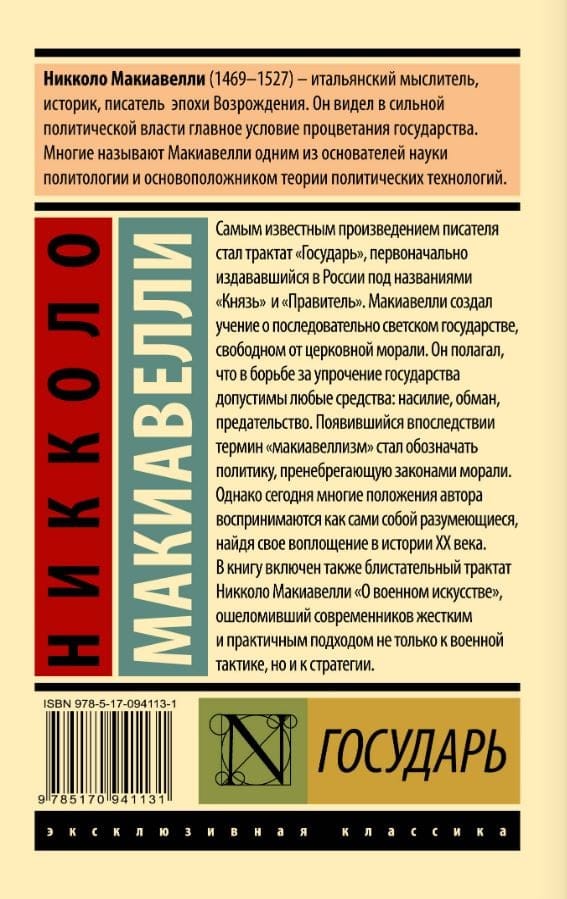 The writer's most famous work was the treatise "The Sovereign", originally published in Russia under the titles "Prince" and "Ruler". Machiavelli created a doctrine of a consistently secular state, free from church morality. He believed that in the struggle to strengthen the state, any means are permissible: violence, deception, betrayal. The term "Machiavellianism" that appeared later began to denote a policy that neglects the laws of morality. However, today many of the author's provisions are perceived as self-evident, having found their embodiment in the history of the 20th century.