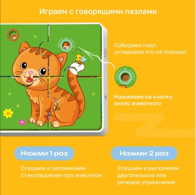 The interactive tablet recognizes all puzzle pictures. Two game modes: with the tablet and with the puzzles. Animal names and sounds are announced. Songs and stories about animals are played. Poems about each animal are included. Speech and motor exercises for development. Volume control for comfortable play. 9 colorful puzzles made of thick cardboard. 36 pieces for developing fine motor skills. Suitable for children aged 1 year and up.