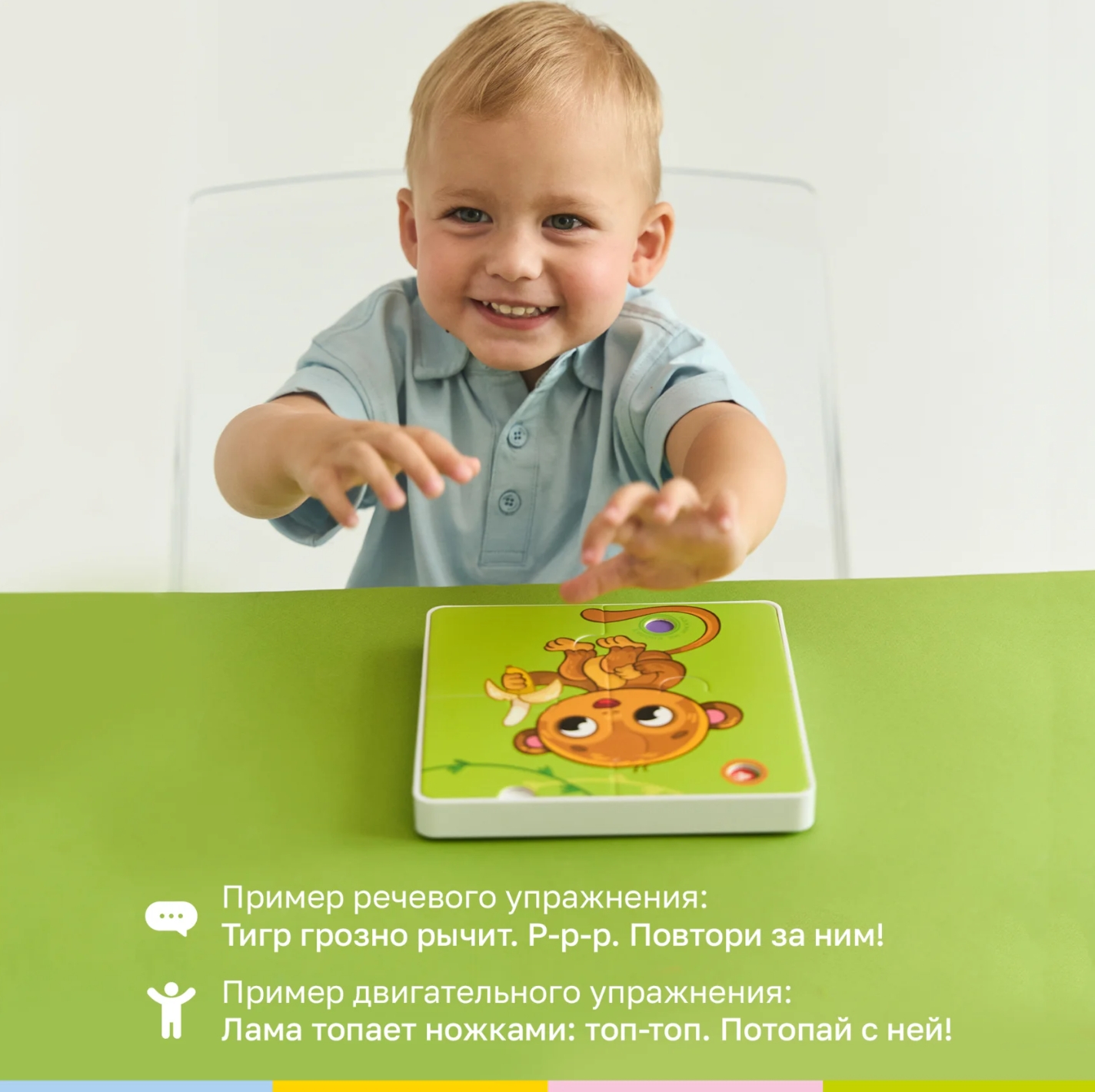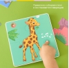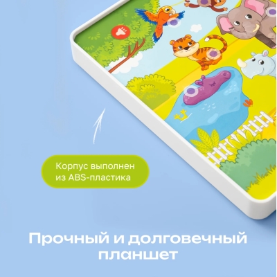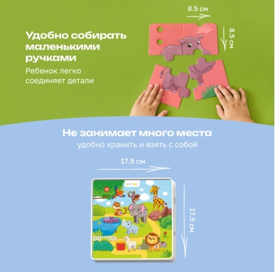 The interactive tablet recognizes all puzzle pictures. Two game modes: with the tablet and with the puzzles. Animal names and sounds are announced. Songs and stories about animals are played. Poems about each animal are included. Speech and motor exercises for development. Volume control for comfortable play. 9 colorful puzzles made of thick cardboard. 36 pieces for developing fine motor skills. Suitable for children aged 1 year and up.