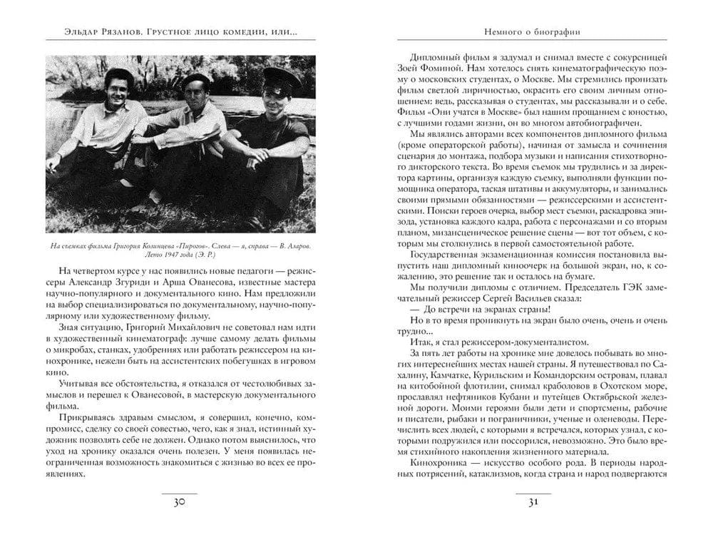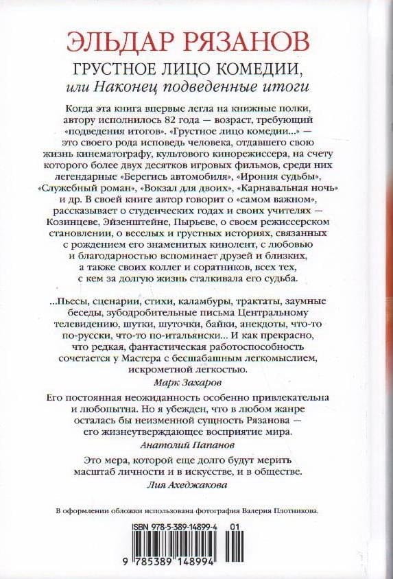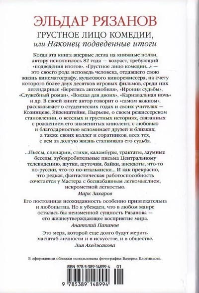 When this book first hit the bookshelves, the author was 82 years old - an age that requires "taking stock". "The sad face of comedy, or..." - is a kind of confession of a man who gave his life to the cinema, a cult film director, which accounted for more than two dozen feature films, among them the legendary "Beware of the Car", "The Irony of Fate", "Office Romance", "Station for Two", "Carnival Night" and others. By the author's admission, he has been "laboring like a horse" all his life. In addition to films, Eldar Ryazanov created more than two hundred author's TV programs, wrote plays, novels, screenplays and poems, was a teacher and producer ... In his book, the author talks about the "most important", tells about his student years and his teachers - Kozintsev, Eisenstein, Piryev, about his directorial development, the funny and sad stories associated with the birth of his famous films, with love and gratitude recalls friends and relatives, as well as artists, artists, composers, cameramen, editors - his colleagues and associates, all those with whom his fate encountered during his long life.