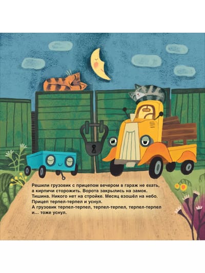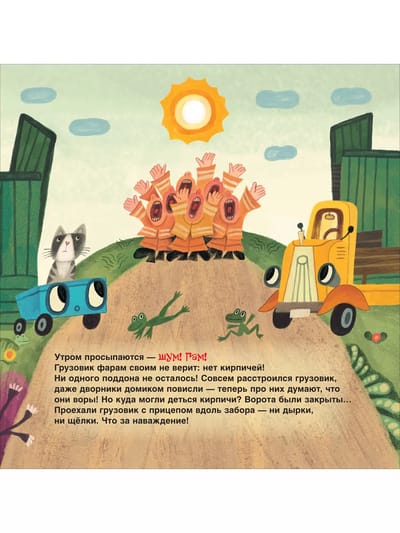 Where will the inseparable friends go this time? Of course, to the construction site! And there... Noise, noise, bustle: bulldozer roars, excavator rumbles, concrete mixer rumbles, builders in helmets are running back and forth - all are building a house! But the bricks are missing somewhere... The truck and the trailer, hurry up and look for them!