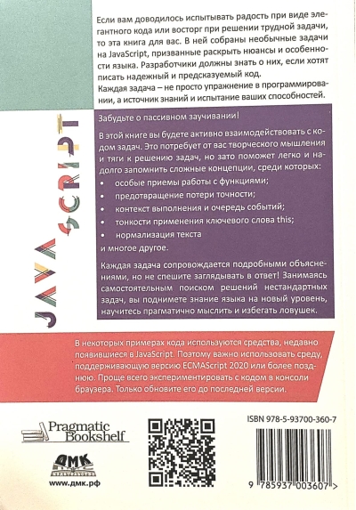If you've ever experienced the joy of elegant code or the thrill of solving a challenging problem, then this book is for you. It features unusual JavaScript challenges designed to reveal the nuances and quirks of the language. Developers must understand these nuances if they want to write reliable and predictable code. Each challenge is more than just a programming exercise; it's a source of knowledge and a test of your abilities. In this book, you'll actively interact with the challenges' code. This will require creative thinking and a passion for problem-solving, but it will also help you easily and permanently remember complex concepts, including: