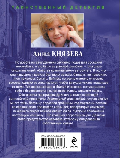 On the way to the dacha, Daineka accidentally cut off a neighboring car, and it was her fatal mistake - she witnessed the murder of a criminal authority. The bandits did not believe that she had broken the rules without malice, and she had to flee. Daineka did not take the situation seriously, but her father insisted that the girl went far away from home. So she found herself in Italy and finally felt safe, but, as it turned out, too soon... Circumstances led Daineka to the castle of a real Sicilian princess. The famous Italian island holds many secrets. The girl was struck by the tombs, where the dead look like sleeping people, although they have been lying for hundreds of years; the laboratory of an alchemist, who was looking for the secret of eternal life; a doll, frighteningly similar to a real woman... But the main shock for Daineka was the betrayal of the man to whom she trusted her own life!...