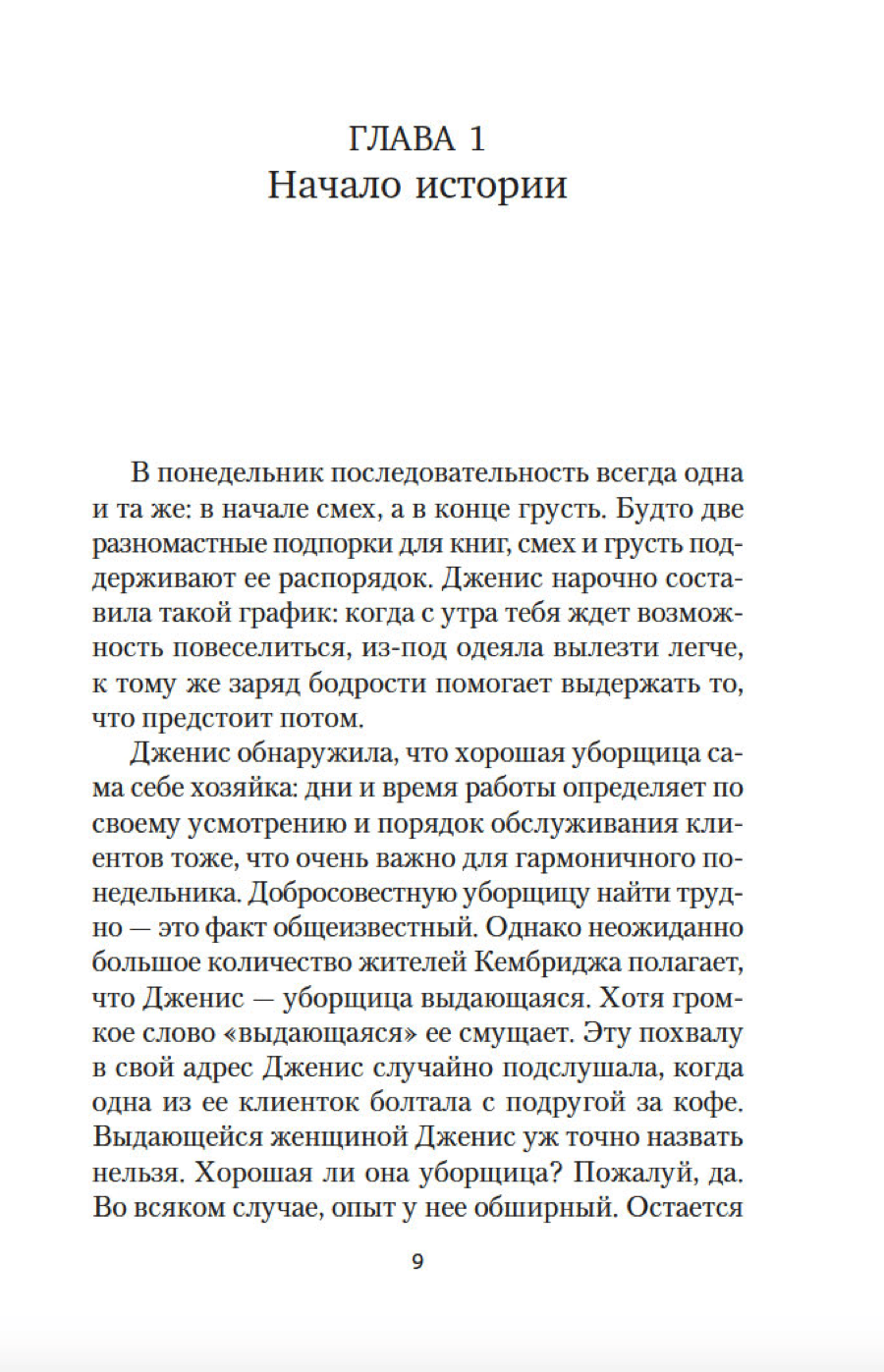 She doesn't remember how her collection began. Maybe with a snippet of conversation overheard while she was cleaning the kitchen sink? Janice noticed that people told her about themselves while she was dusting the living room or defrosting the refrigerator, and at a certain point she began to listen, to delve into these stories, to collect and store them... This is the only way to really get to know people and understand what kind of society surrounds you. At the same time, no one was interested in Janice's life until she started working for Mrs. B. However, Janice, in her opinion, has nothing to tell. But Mrs. B, at ninety-two, is smart and perceptive, she suspects that Janice's story deserves the closest attention...