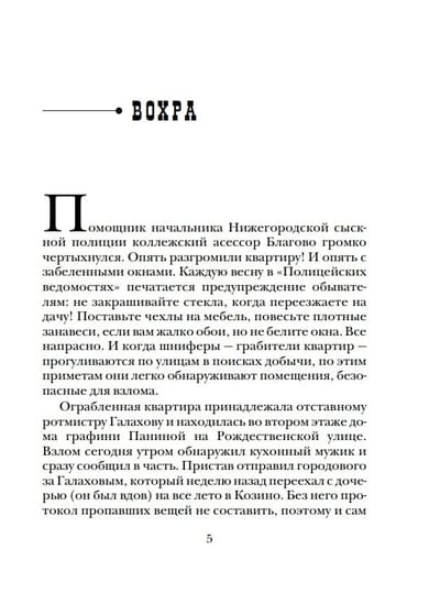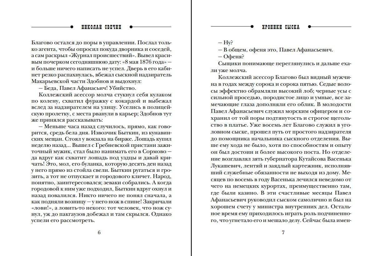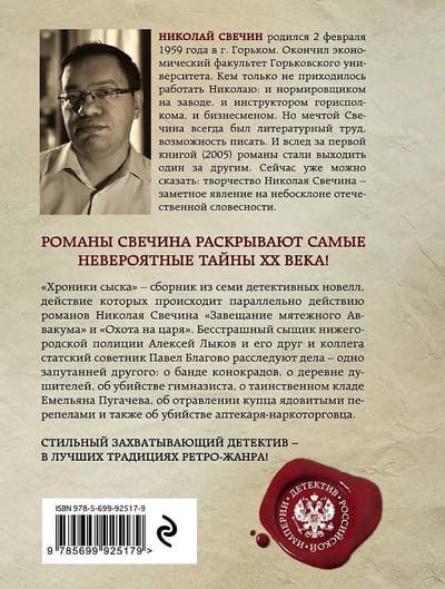 "Detective Chronicles" is a collection of seven detective stories set parallel to Nikolai Svechin's novels "Avakum's Testament" and "The Hunt for the Tsar." Fearless Nizhny Novgorod police detective Alexei Lykov and his friend and colleague, State Councilor Pavel Blagovo, investigate cases, each more intricate than the next: a gang of horse thieves, a village of stranglers, the murder of a high school student, Yemelyan Pugachev's mysterious treasure, the poisoning of a merchant with poisonous quail, and the murder of a drug dealer.