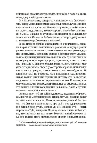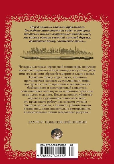 Four masters of Persian miniatures are commissioned to illustrate a secret book for the Sultan, so that his name and deeds will be immortalized and celebrated for centuries. However, rumors circulate throughout the city that the book violates the laws of the Muslim world, that it was created according to the principles of Venetian atheists, and that any unwary witness who dares to look at the forbidden pages will inevitably go blind. After the brutal murder of one of the artists, it becomes clear that continuing to work on the Sultan's commission is mortally dangerous, and the identity of the killer can only be determined by carefully examining the intricate lines of the mysterious drawing...