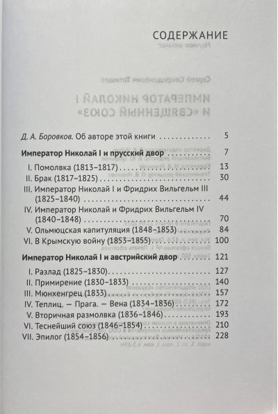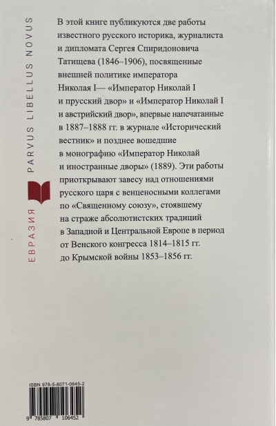 This book contains two works by the renowned Russian historian, journalist, and diplomat Sergei Spiridonovich Tatishchev (1846–1906), dedicated to the foreign policy of Emperor Nicholas I: "Emperor Nicholas I and the Prussian Court" and "Emperor Nicholas I and the Austrian Court." These works were first published in 1887–1888 in the journal "Istorichesky Vestnik" and later included in the monograph "Emperor Nicholas and Foreign Courts" (1889). These works lift the curtain on the relations between the Russian tsar and his crowned colleagues in the "Holy Alliance," which stood guard over absolutist traditions in Western and Central Europe from the Congress of Vienna in 1814–1815 to the Crimean War in 1853–1856.