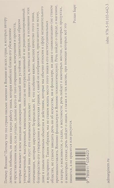 This book, which Barthes himself called "the happiest" of all his books, is inspired by his travels to Japan and, more broadly, by the "Japanese text" of his life: his early fascination with haiku, later calligraphy, bunraku theater, and so on. It is a Barthesian "illustrated guide" to the country (both real and imagined) where he dreamed of living but never settled. The Russian translation of The Empire of Signs, first published in 2004, is published in a new edition, complete with a detailed commentary and afterword by the translator and editor.
