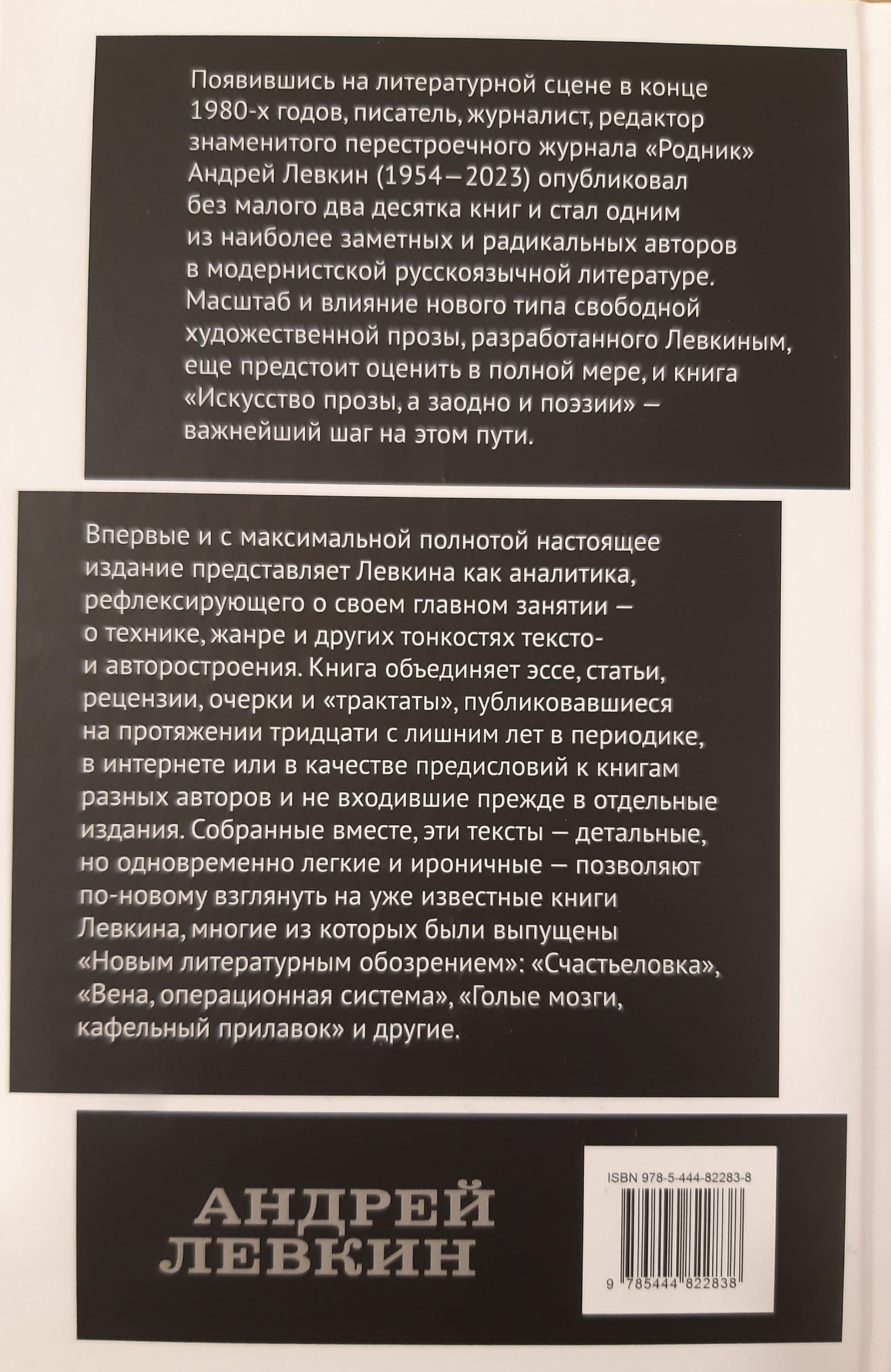 Appearing on the literary scene in the late 1980s, Andrei Levkin (1954-2023), writer, journalist, and editor of the famous Perestroika magazine Rodnik, published nearly two dozen books and became one of the most prominent and radical authors in modernist Russian-language literature. The scope and influence of the new type of free fiction prose developed by Levkin has yet to be fully appreciated, and the book "The Art of Prose, and at the same time of Poetry" is a crucial step on this path. For the first time and with maximum completeness, this edition presents Levkin as an analyst reflecting on his main occupation - on technique, genre and other subtleties of text- and author-building. The book brings together essays, articles, reviews, essays, and "treatises" published over the course of more than thirty years in periodicals, on the Internet, or as prefaces to books by various authors, and not previously included in separate editions. Collected together, these texts - detailed, but at the same time light and ironic - allow us to take a fresh look at Levkin's already well-known books, many of which were published by the New Literary Review: "Schastielovka," "Vienna, Operating System," "Naked Brains, Tile Counter," and others.