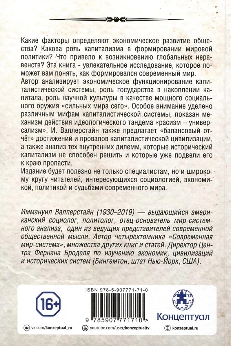 The author analyzes the economic functioning of the capitalist system, the role of the state in the accumulation of capital, the role of scientific culture as a powerful social weapon of the "powers that be". Particular attention is paid to various myths of the capitalist system, the mechanism of action of the ideological tandem "racism - universalism" is shown. I. Wallerstein also offers a "balance sheet" of the achievements and failures of capitalist civilization, as well as an analysis of those internal dilemmas that historical capitalism is unable to solve and which have already brought it to the brink of the abyss.