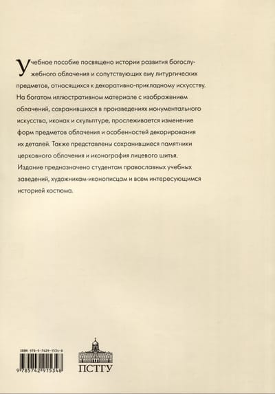 This textbook explores the history of the development of liturgical vestments and related liturgical items related to decorative and applied arts. Rich illustrations of vestments preserved in monumental works of art, icons, and sculpture trace the changing shapes of vestments and the decorative features of their details. Surviving examples of church vestments and the iconography of ecclesiastical embroidery are also presented.