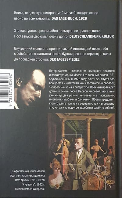 Peter Flamm is the creative pseudonym of psychiatrist and writer Erich Mosse, who fled Nazi Germany for the United States in 1933. He became famous for his 1926 novel "Me?", which was forgotten in the turmoil of the 20th century, but almost a hundred years later became a striking literary discovery as a newfound classic of the expressionist genre.