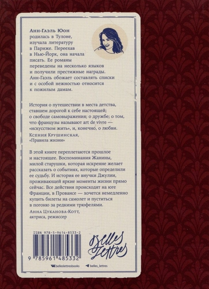 Soulful, warm and full of sincerity, the narrative takes us to sunny Provence, filled with subtle aromas of lavender and black truffles, the music of love and the atmosphere of half-forgotten secrets. One by one, the pages of the diary reveal to Julia the history of her family, full of dramas and hopes, love and treachery. A dive into the past affects Julia's own life in the most unexpected ways, radically changing it and offering forgiveness, inspiration and hope. This novel is written by Anne-Gaelle with a special warmth in memory of her beloved grandmother.