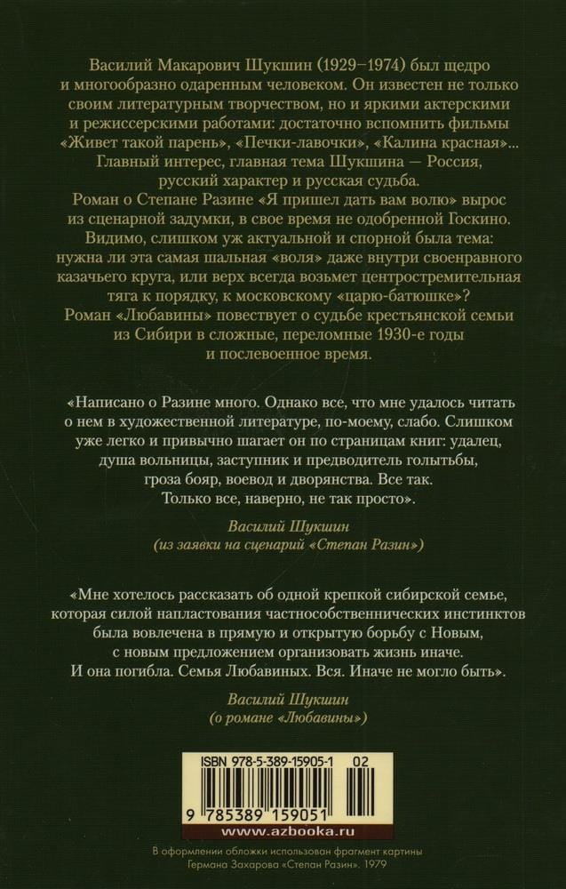 The main interest, the main theme of Shukshin - Russia, Russian character and Russian destiny. The novel about Stepan Razin "I came to give you the will" grew out of a script idea, at one time not approved by Goskino. Apparently, too relevant and controversial was the topic: whether this very stray "will" even within the willful Cossack circle or the top will always take centripetal thrust to order, to the Moscow "tsar-batiushka"?