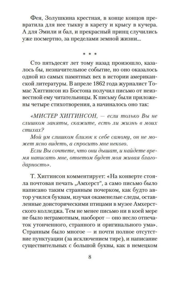 The creative destiny of the American poetess Emily Dickinson, who was born in the small town of Amherst, where she lived almost without leaving until her death in voluntary seclusion, is amazing. During Dickinson's life, only seven of her poems were published anonymously, and her first small collection was published posthumously. Meanwhile, Dickinson's rich poetic legacy consists of almost two thousand poems. Nature, love, the mystery of life and death are the main themes of her work, which was only truly appreciated at the beginning of the twentieth century, when Dickinson was recognized as one of the greatest American poets. Dickinson's poetry is distinguished by a special, very personal intonation, unconventional metrics and rhyme, tense rhythm, laconism, abruptness, which often makes the verse difficult to understand, as well as the richness and whimsicality of associations, extraordinary freshness of perception, spontaneity of feeling and vision.