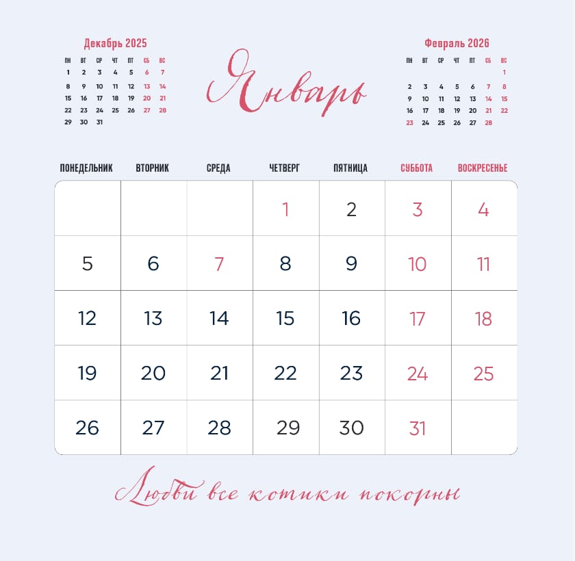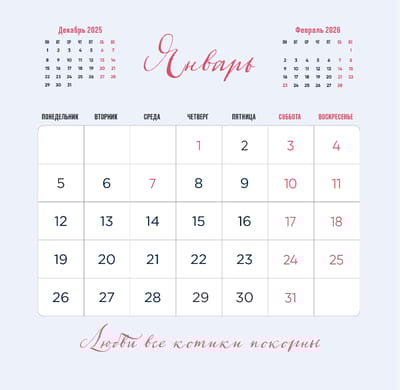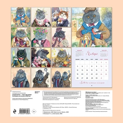 "I purr to you, what more?" is a wall calendar for those who love cats and literature. Each month features a charismatic cat in the form of a cult hero and a punning phrase: a fluffy interpretation of famous literary quotes. This calendar will become a stylish decoration for your interior and will give you intellectual pleasure with a hint of irony.