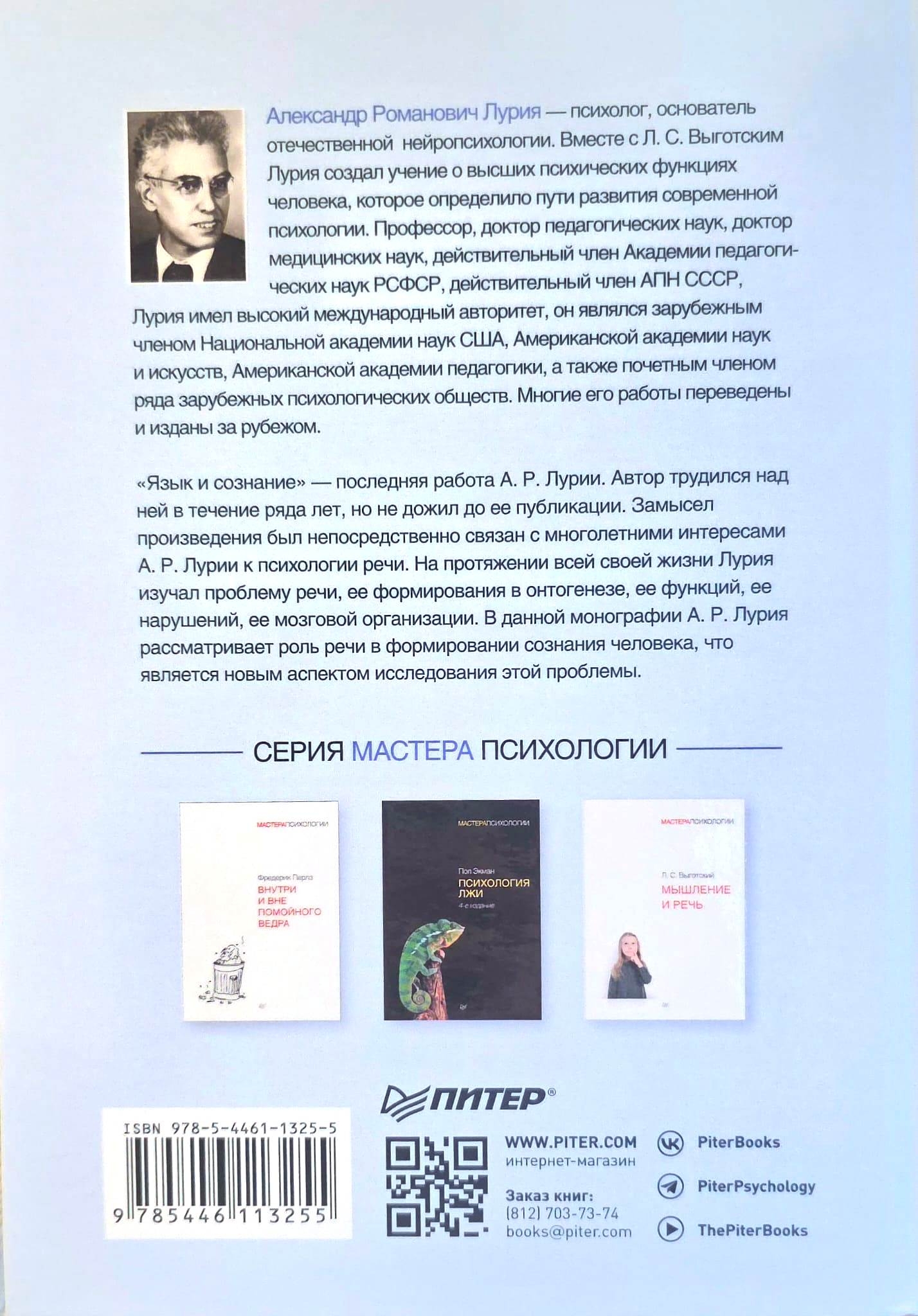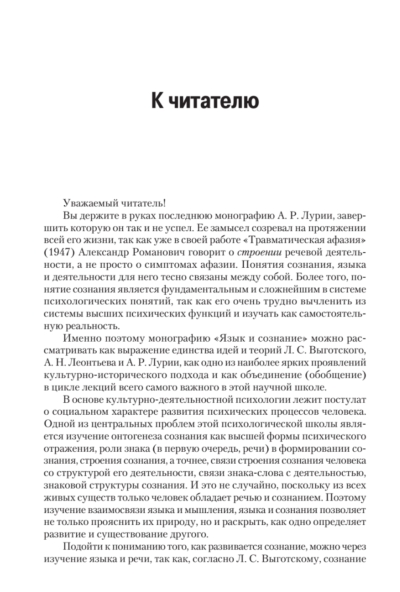 "Language and Consciousness" is A. R. Luria's final work. The author worked on it for several years but did not live to see its publication. The concept for this work was directly related to Luria's long-standing interest in the psychology of speech. Throughout his life, Luria studied the problem of speech, its development during ontogenesis, its functions, its disorders, and its brain organization. In this monograph, Luria examines the role of speech in the formation of human consciousness, which represents a new aspect of this research.