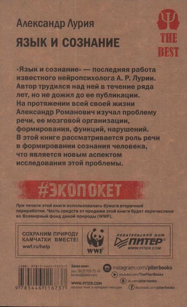 "Language and Consciousness" is the last work of the famous neuropsychologist A. R. Luria. The author worked on it for a number of years, but did not live to see its publication. Throughout his life, Alexander Romanovich studied the problem of speech, its brain organization, formation, functions, disorders. This book considers the role of speech in the formation of human consciousness, which is a new aspect of the study of this problem.