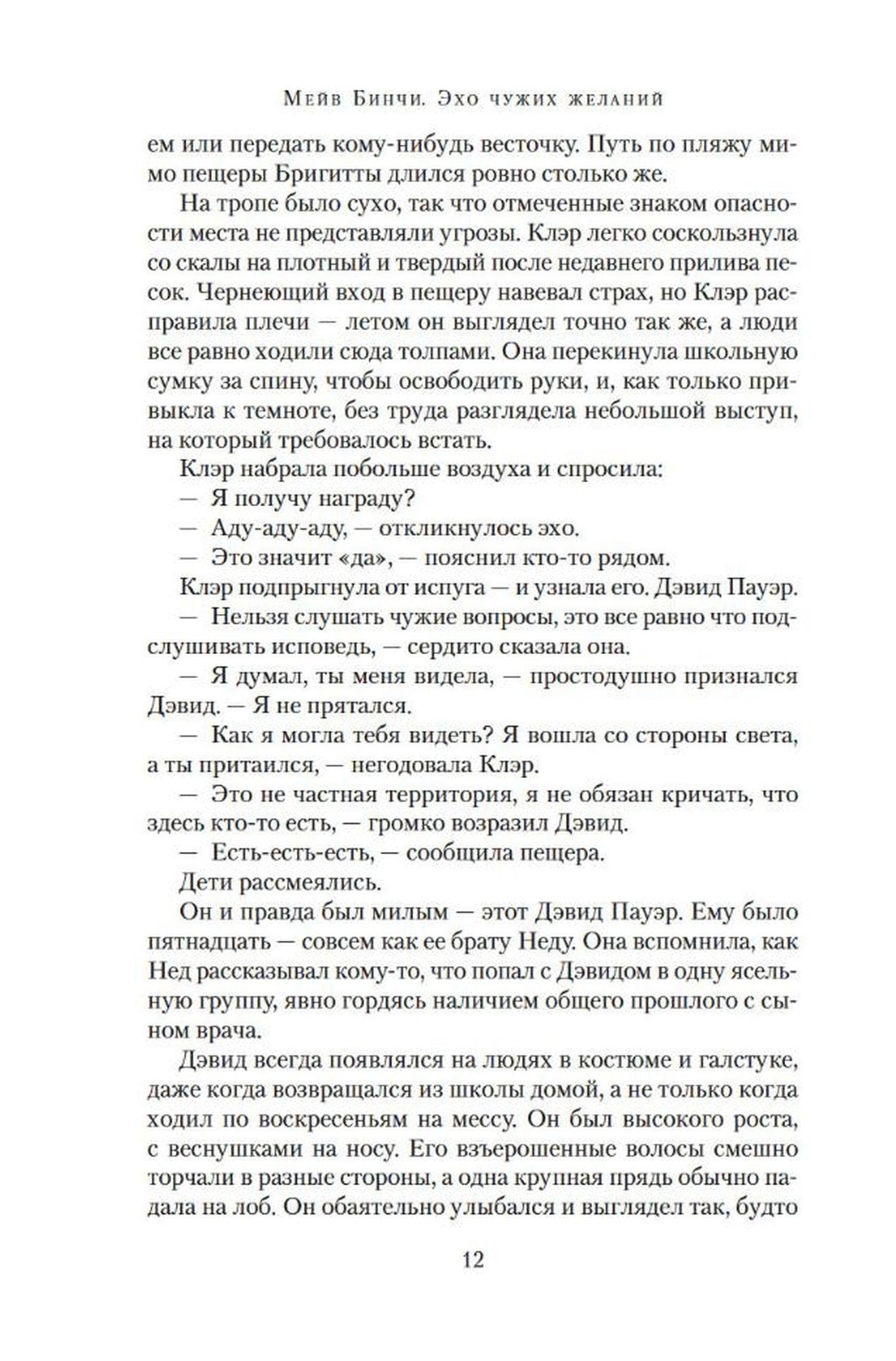 Irish writer and journalist Maeve Binchy (1940-2012) is well known not only in her homeland, but also around the world. In addition to her short stories, Binchy wrote 16 novels, and her books were consistently bestsellers and won prestigious international awards. In the 1970s, Binchy published three collections of short stories, and quite successfully, but the real fame came to her after the first novel "Light a Candle" (1982). Three years later saw the publication of Binchy's second novel "Echoes of Other People's Desires", which also met with a warm response from the reading public. By the sea, in the vicinity of the quiet Irish village of Castlebay, in a cave hides an echo. People believe that if you ask the echo a question, it will certainly answer. One day two teenagers, David and Claire, come here. Their dream is the same: to get away from their hometown. Dreams come true. Claire wins a scholarship to University College Dublin and moves to the capital. David goes there too, dreaming of becoming a doctor. Their paths will cross in the most unexpected way and ... will lead back to the gray deserted Castlebay, where once against the background of family secrets, gossip and tangled relationships played out a drama of ambition, betrayal and love ...