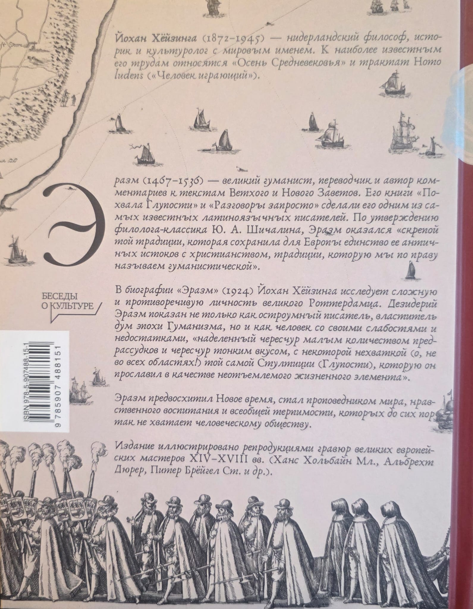 Johan Huizinga (1872-1945) was a world-renowned Dutch historian and cultural scholar whose work predated the Annales School. His most famous works, constantly reprinted worldwide, include The Autumn of the Middle Ages and the treatise Homo ludens (Man at Play). Erasmus (1467-1536) was a great humanist, translator, and commentator on the Old and New Testaments. His books The Praise of Folly and Conversations easily made him one of the most famous writers in the Latin language. According to the classical philologist Yu. A. Shichalin, Erasmus proved to be "the glue that holds together the tradition that preserved for Europe the unity of its ancient origins with Christianity, a tradition we rightly call humanistic." In his biography Erasmus (1924), Huizinga explores the complex and contradictory personality of the great Rotterdamer. Desiderius Erasmus is portrayed not only as a witty writer and philosopher, a leading figure in the Age of Humanism, but also as a man with his own weaknesses and shortcomings, "endowed with too few prejudices and too refined taste, with a certain lack (oh, not in all areas!) of that very Stultitia (folly) which he extolled as an essential element of life." Erasmus anticipated the modern era not only in his convictions but also in his personality and character. He became a preacher of peace, moral education, and universal tolerance, which are still sorely lacking in human society.