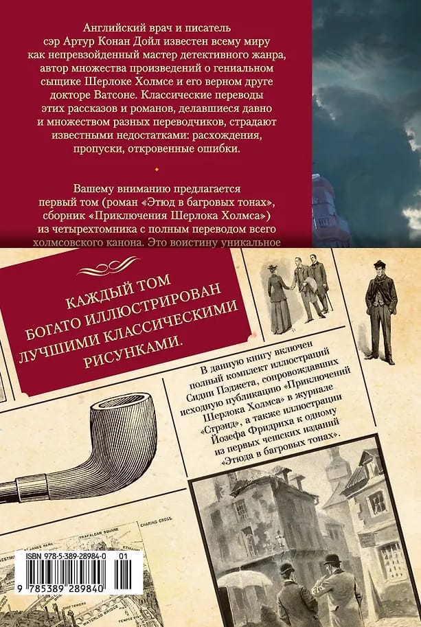 We present the first volume (the novel "A Study in Scarlet," the collection "The Adventures of Sherlock Holmes") of a four-volume set featuring a complete translation of the entire Holmes canon. This is a truly unique edition: all works in the series have been newly translated by Lyudmila Brilova and Sergey Sukharev—masters whose translations of Kazuo Ishiguro and Ray Bradbury, F. Scott Fitzgerald and Charles Palliser, Thomas de Quincey, Herman Melville, and others have long since become classics. Each volume also features a large number of classic illustrations and additional materials: prefaces to early publications, Conan Doyle's memoirs on various works, and several interviews with the writer.