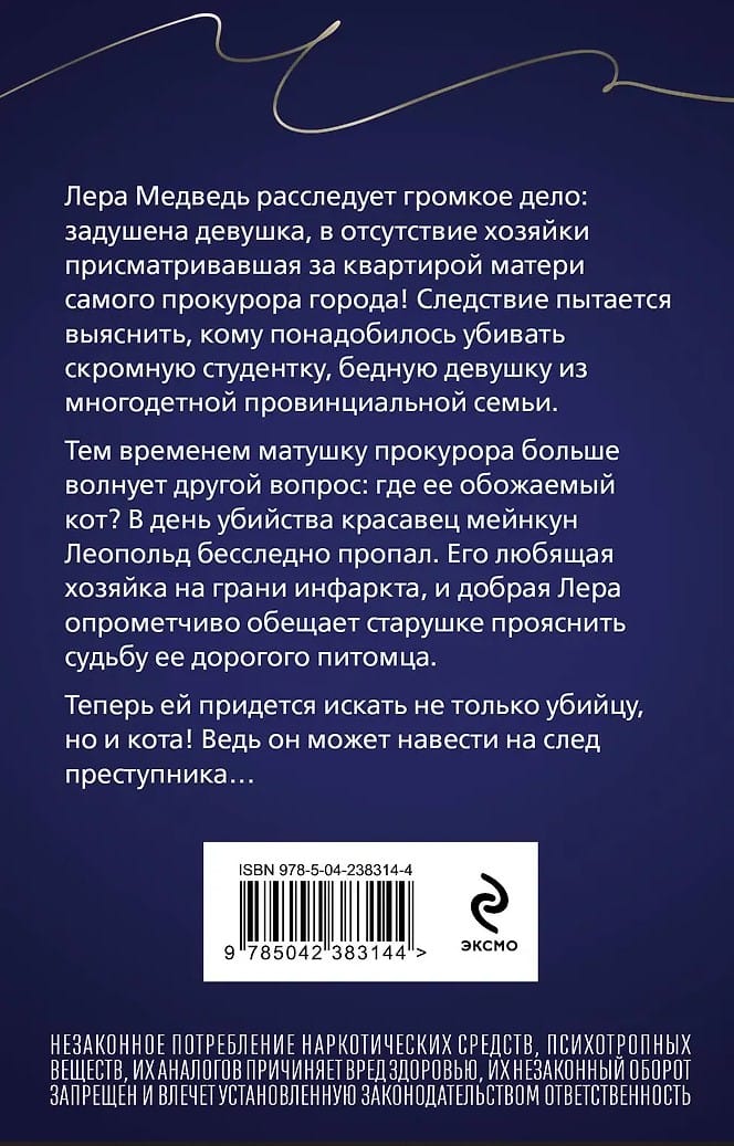 Lera Medved investigates a high-profile case: a girl who was looking after the apartment of the mother of the city prosecutor's mother in the absence of her landlady has been strangled! The investigation is trying to find out who needed to kill a modest student, a poor girl from a large provincial family. Meanwhile, the prosecutor's mother is more concerned with another question: where is her adored cat? On the day of the murder, the handsome Maine Coon Leopold disappeared without a trace. His loving mistress is on the verge of a heart attack, and kind Lera recklessly promises the old lady to clarify the fate of her dear pet. Now she will have to look not only for the killer, but also for the cat! However, Leopold may turn out to be an important witness - he was at the scene of the crime! But what kind of help to the investigation can be expected from an unintelligent animal?...?
