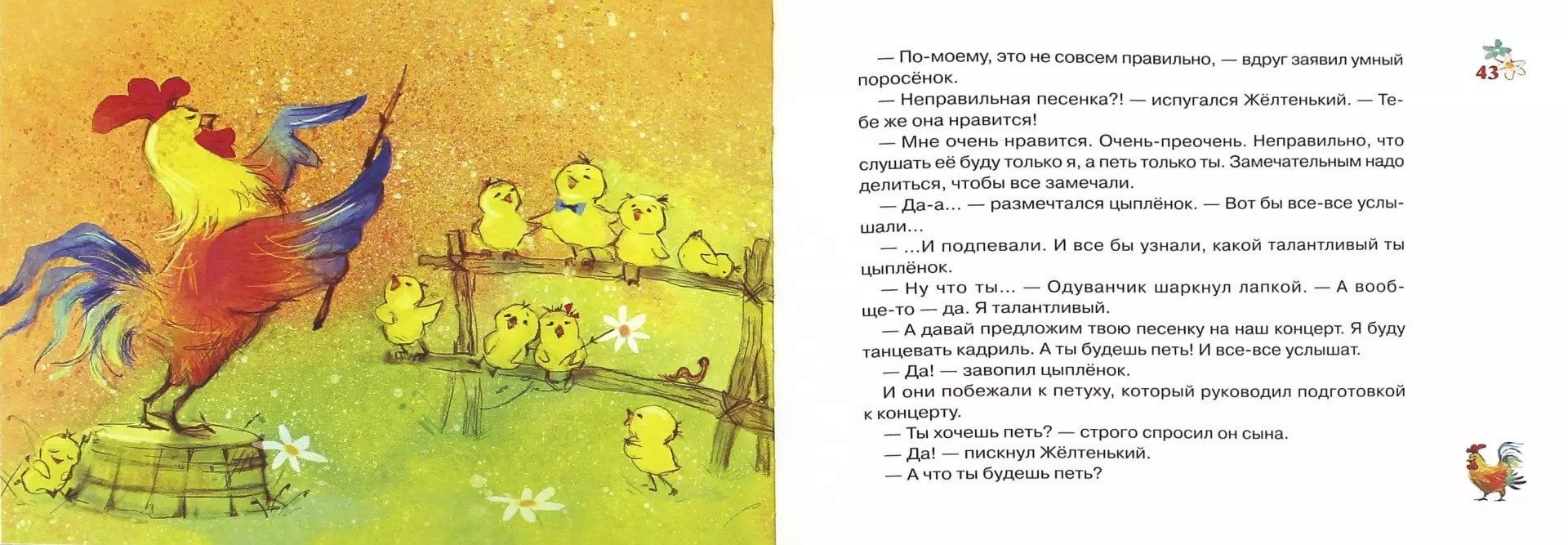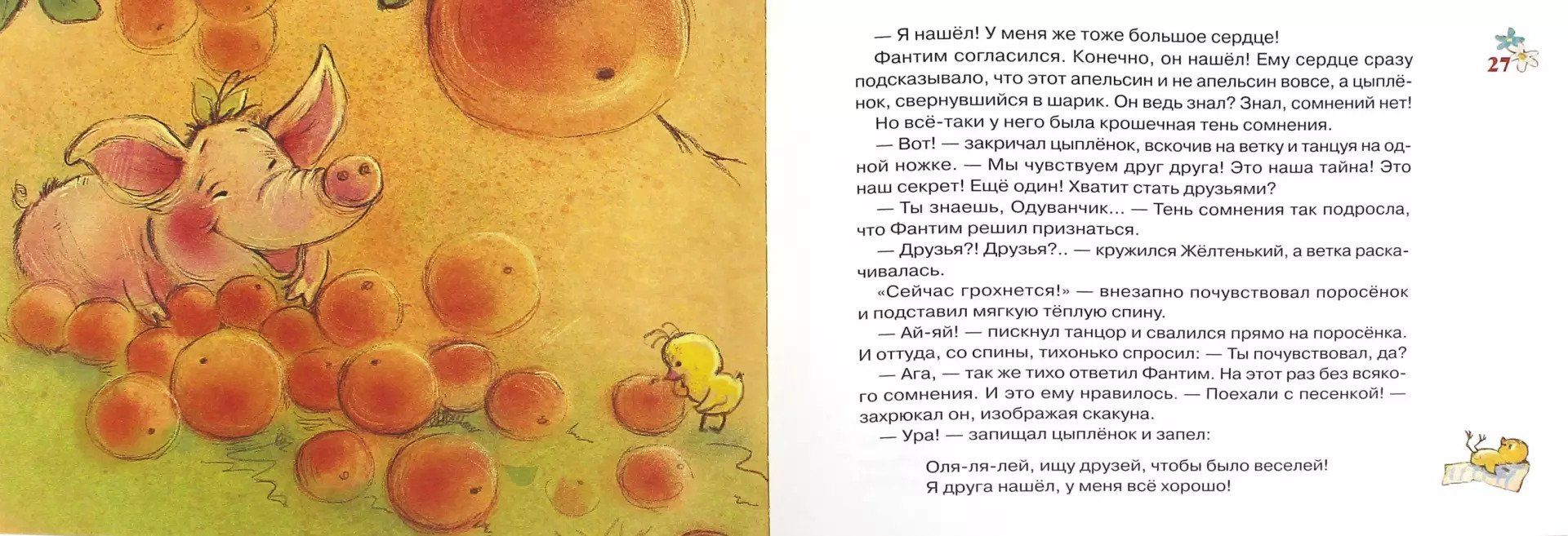 You say it can't happen? You say it can't happen?! Then watch, watch and listen! Don't say you haven't heard it. Fantasmian the pig and Dandelion the chicken became best friends. Not right away, of course. First they had to learn each other's biggest and most secret secrets. Because friends are the best keepers of secrets. And if your friend lost your secret or, say, forgot somewhere, then maybe he is not quite a friend...? That's what the pig thought. He's a real smart guy and a philosopher. And the chicken just made up a song about it!